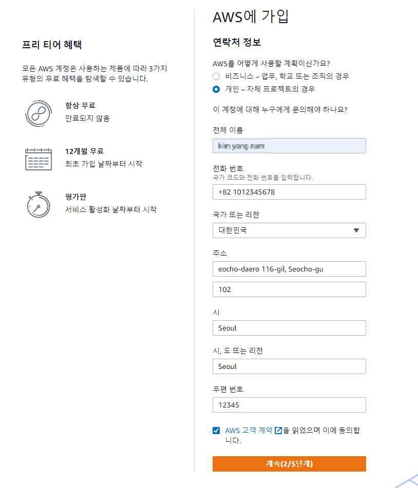 2. 계정유형은 "개인"을 선택 하고 개인 정보들을 입력한다.