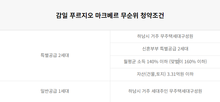 하남시에 거주하는 무주택 세대구성원이 가능하고, 특별공급 2세대와 일반공급 1세대 총 3세대가 청약이 가능합니다.