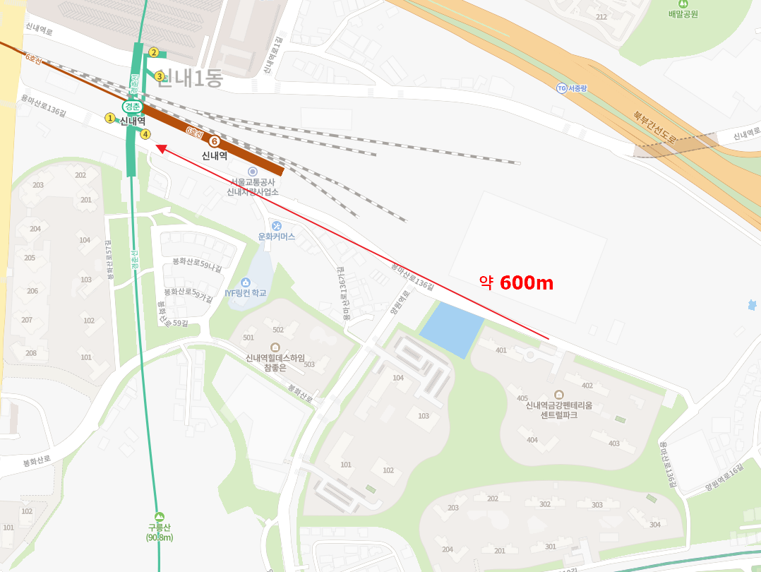 네이버 지도를 통해 거리를 확인해보면 약 600m 도보거리로 신내역을 이용할수 있습니다.