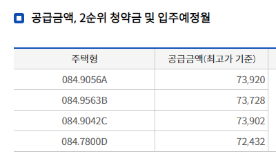 7억2천 ~ 7억3억9백 만원 까지 공급 금액을 형성 하고 있으며, 분양 가격이 다소좀 아쉽긴 합니다.