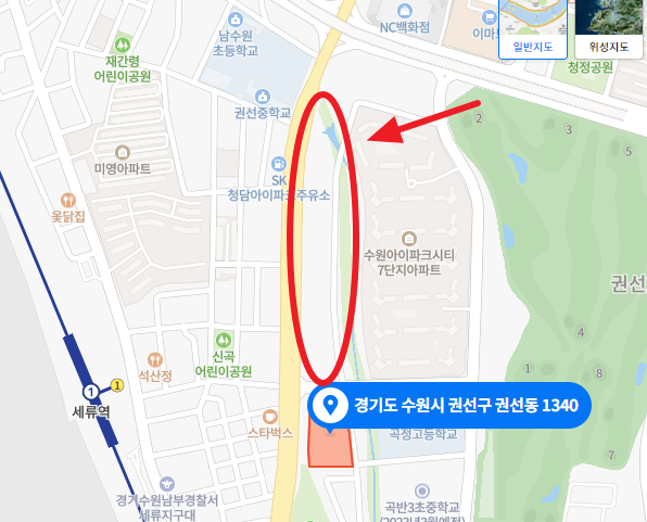 해당 아파트의 위치는 1호선 세류역에 인접해 있는것이 확인됩니다.