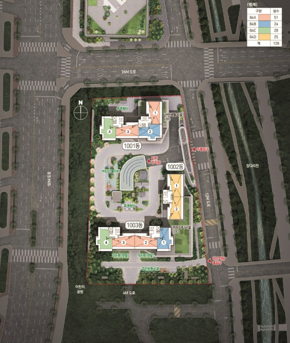 1001, 1003동은 왕복 6차선 도로쪽으로 소음이 있을수 있겠네요.