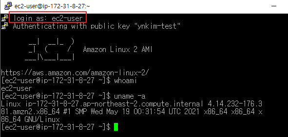 7. 기본 유저이름 'ec2-user' 를 입력 해준다.