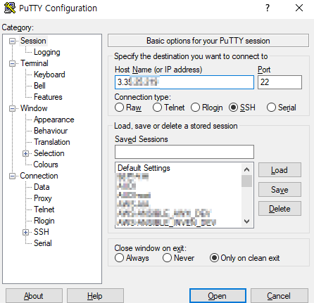 5. putty - HostName에 아이피를 설정 해주자.