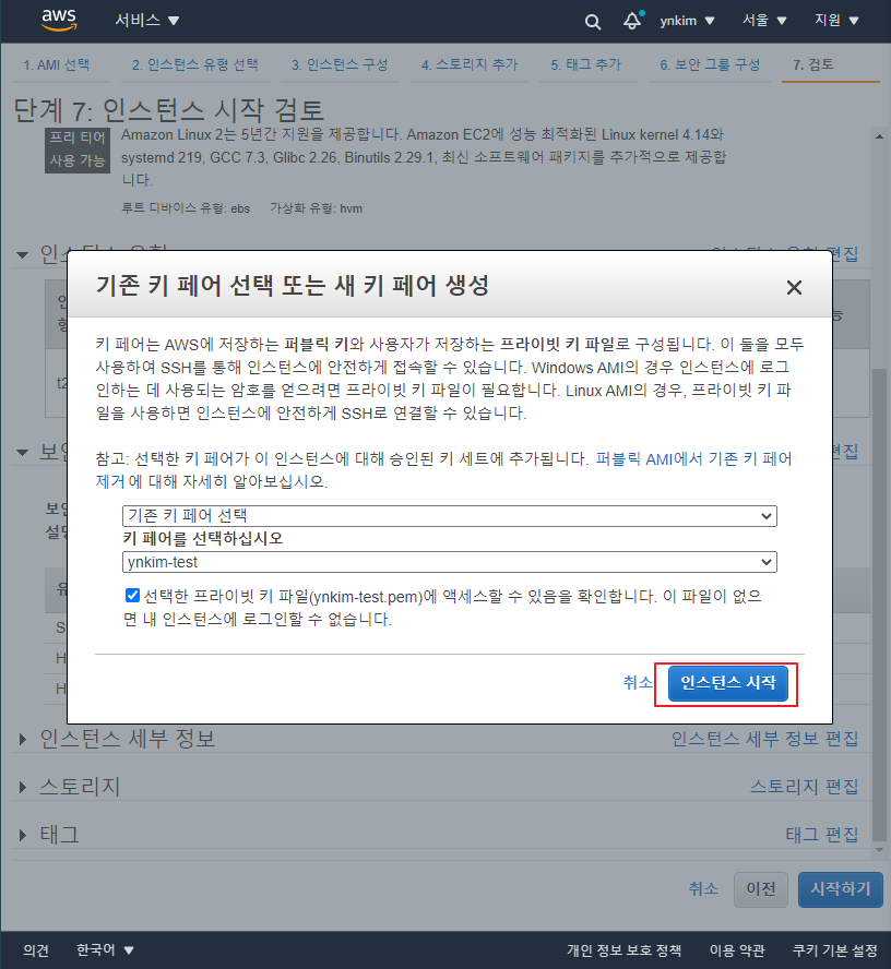 6. 키페어를 선택해주고 인스턴스 시작 을 해주자.