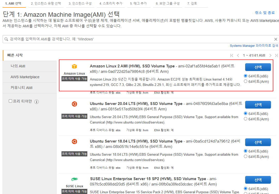 Amazon Linux 2 AMI (HVM), SSD Volume Type 클릭