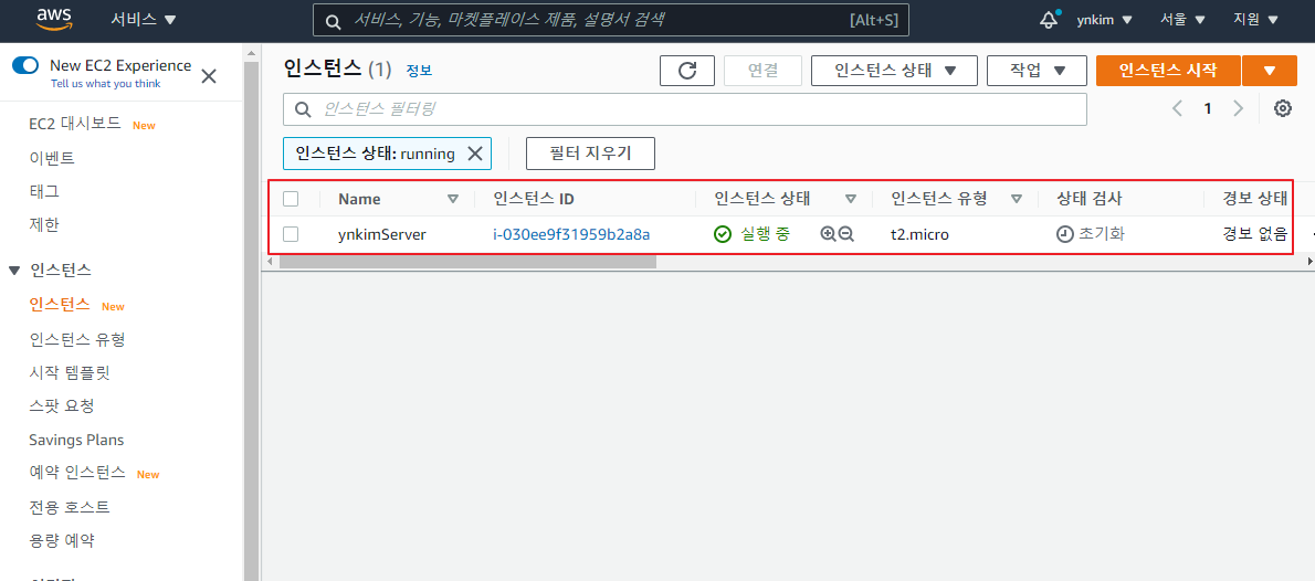 방금전에 만들었던 EC2 인스턴스가 만들어 진걸 볼수 있다.