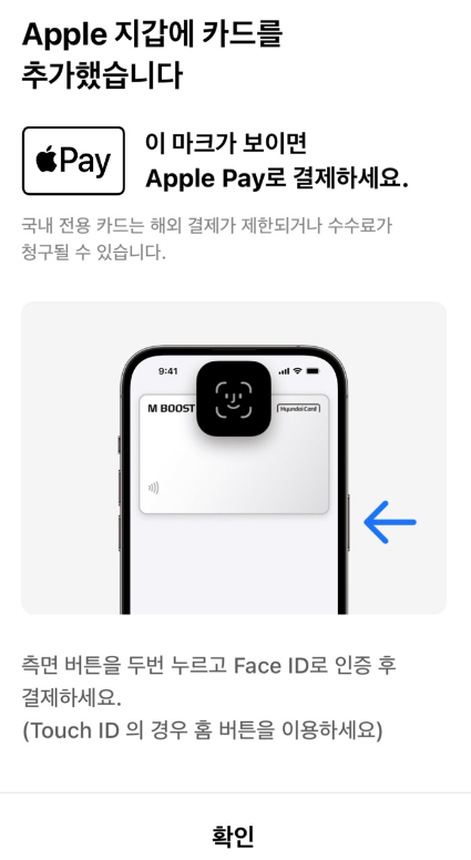 6. 애플워치로 카드 정보가 전송되면, 측면 버튼을 이중 클릭하여 결제할 준비 완료