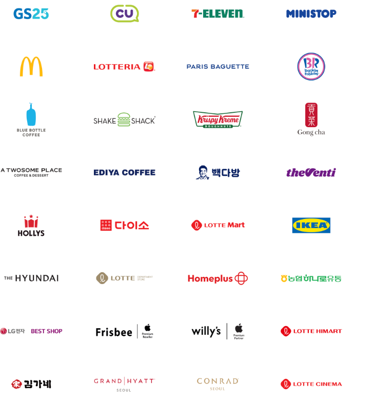 • 백화점/쇼핑몰: 롯데백화점, 롯데 아울렛, 롯데몰, 현대백화점, 현대백화점 면세점, AK플라자, 파르나스몰, 아이파크몰, 엘리웨이, 신라면세점, 무신사 스탠다드, 이니스프리