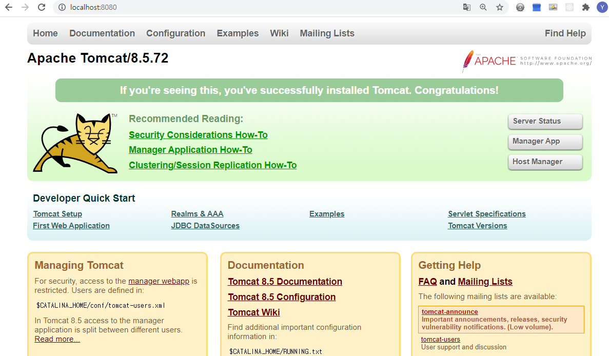 Tomcat의 기본페이지가 8080 포트로 확인이 된다.