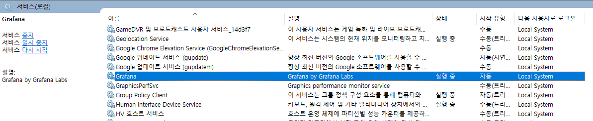 윈도우 서비스에 Grafana 서비스가 등록 됩니다.