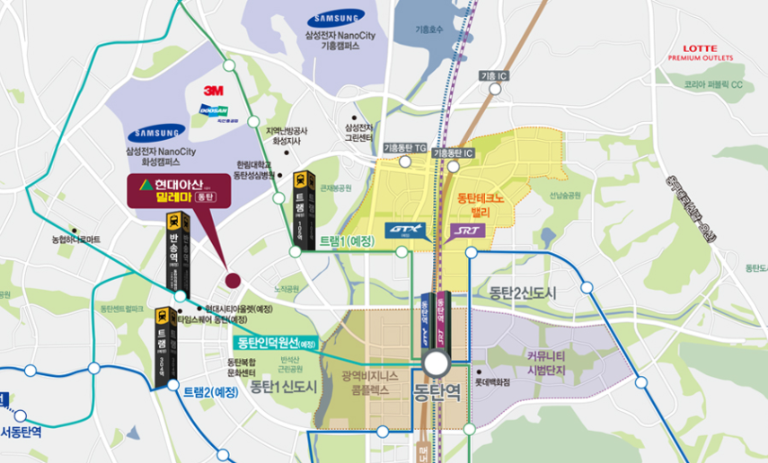 아래 반송 역(예정)이 가깝고 위쪽으로 트램(예정)을 타고 동탄역에 접근하는 것이 수월할 것으로 예상됩니다