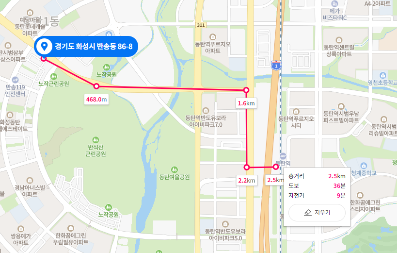 동탄 SRT역과는 약 2.5km가량 되는 것으로 확인되고 도보로 걸어서는 접근하는 데에는 거리가 조금 있습니다.