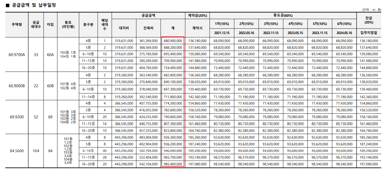 6. 공급금액 - 민영주택 늘 그러하듯 계약금은 20%