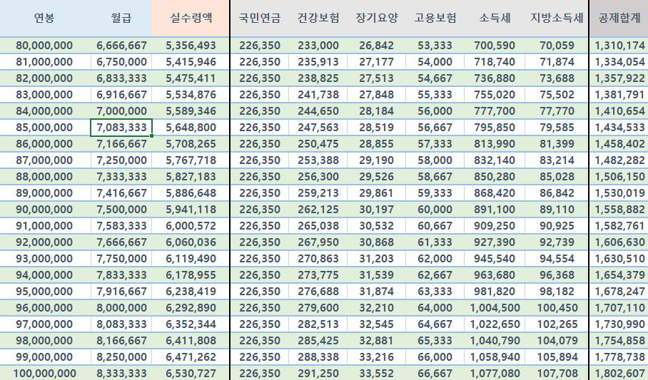 연봉 8000만원의 경우에는 월급 6,666,667에서 공제금 1,310,174원을 빼고 약 535 만원의 실수령액 월급을 받습니다. 다음 8100만원 - 1억 구간에 대해서 알아볼까요??