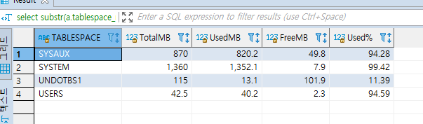 테이블 스페이스이름 , 총용량, 사용용량, 여유용량, 사용율 항목을 확인 할수 있다.