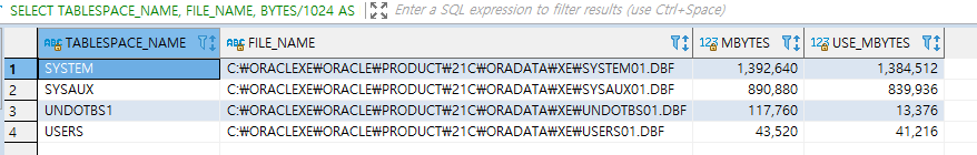 SELECT TABLESPACE_NAME, FILE_NAME, BYTES/1024 AS MBytes, RESULT/1024 AS USE_MBytes FROM