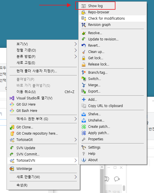 Totorisesvn - show log 를 클릭한다.
