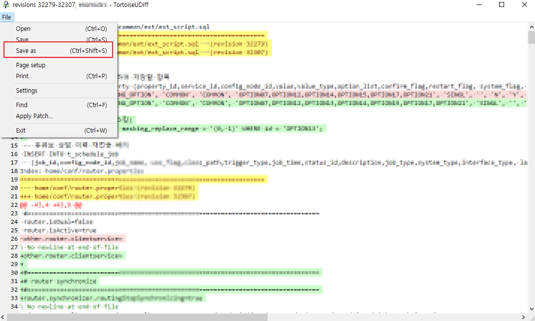 > show differences as unified diff 클릭