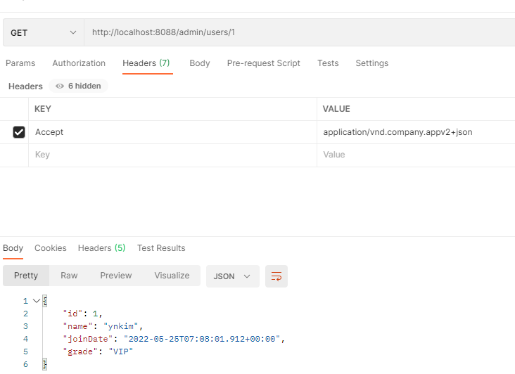 Accept값에 application/vnd.company.appv2+json 를 넣어주면 2번째 메서드 호출된다.