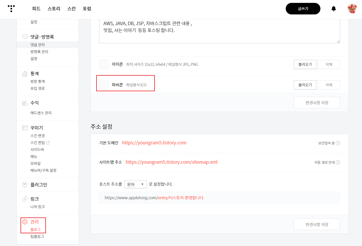 5. tistory 블로그 관리 - 블로그 - 파비콘