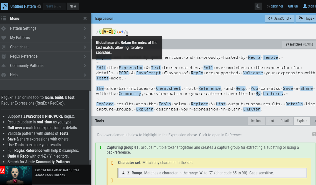 2. 정규표현식 테스트 사이트 - regexr.com (클릭)
