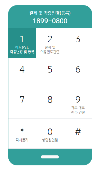 카드발급, 카드분실신고 해제, 휴면카드 계속 사용, 각종변경 및 등록, 결제 및 이용한도 관련과 같은 서비스를 이용하시려면 해당 번호로 연락을 하시면 됩니다.