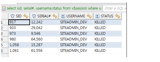 select sid, serial#, username,status from v$session where username = 'SITEADMIN_DEV';