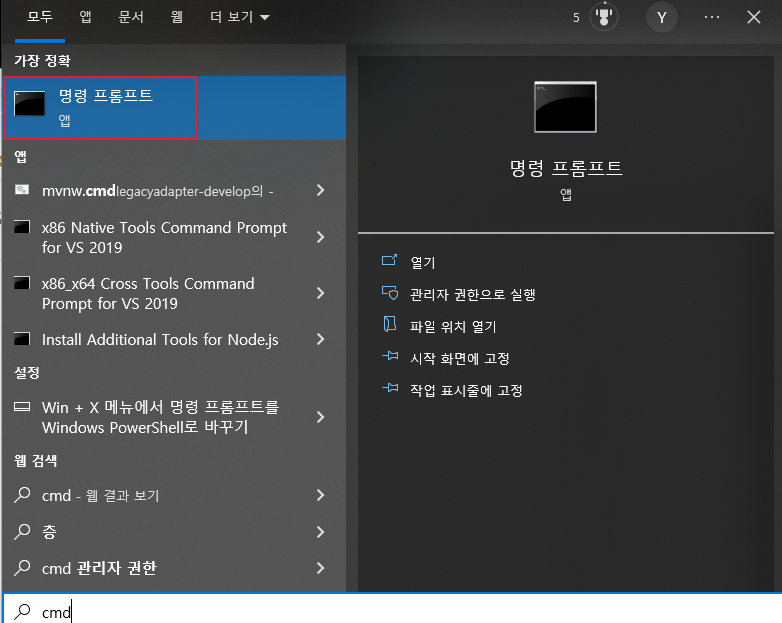 cmd 라고 치면 명령 프롬프트가 나온다.